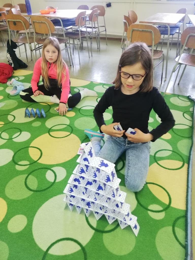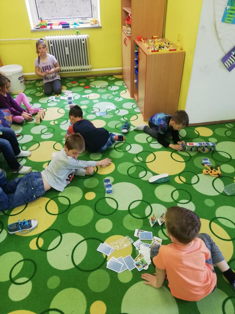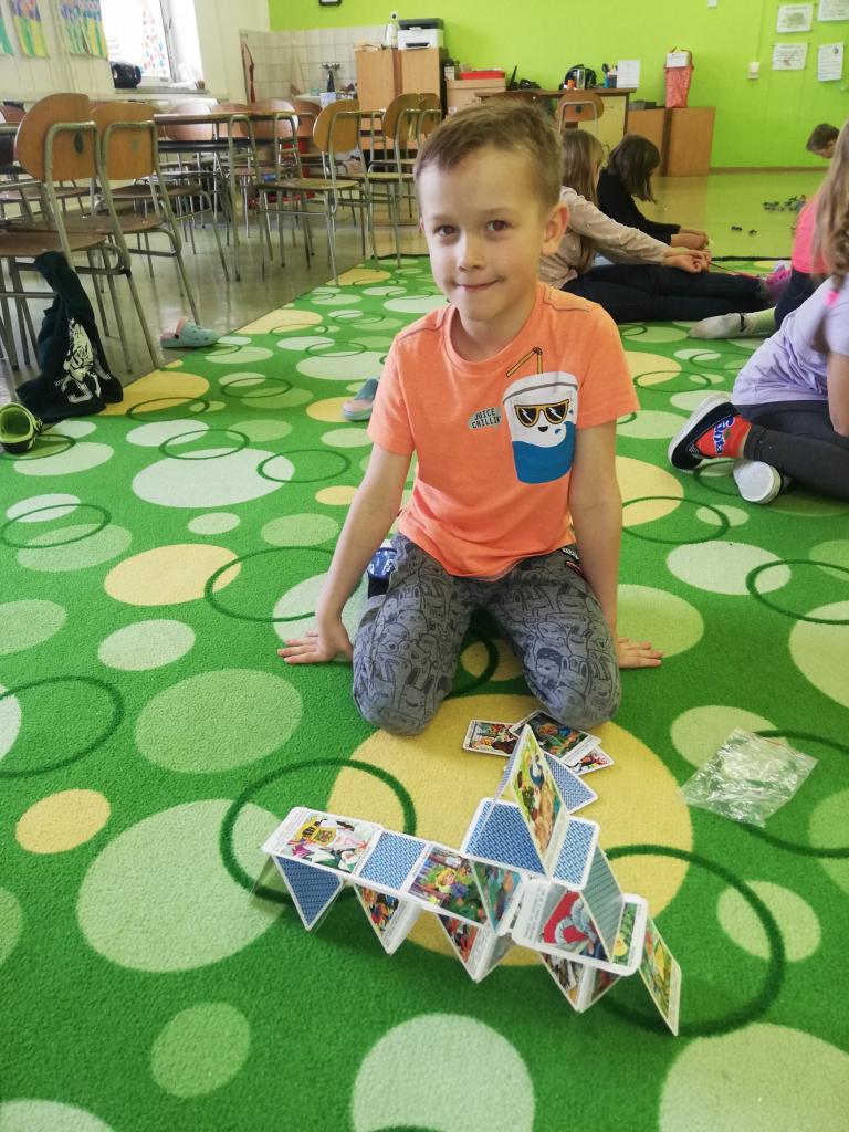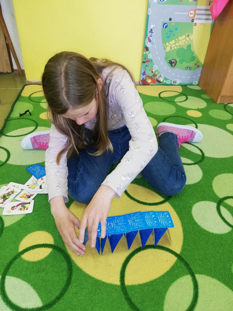 Děti pomocí karet stavěly pyramidy a z dominových kostek různé labyrinty. Trénovaly tak jemnou motoriku, trpělivost a soustředěnost. Byly moc šikovní a ve výsledku každý dosáhl svého cíle.