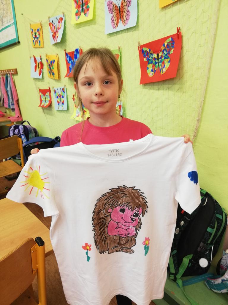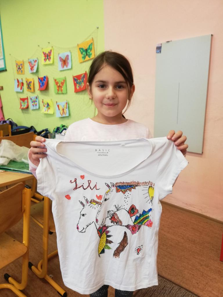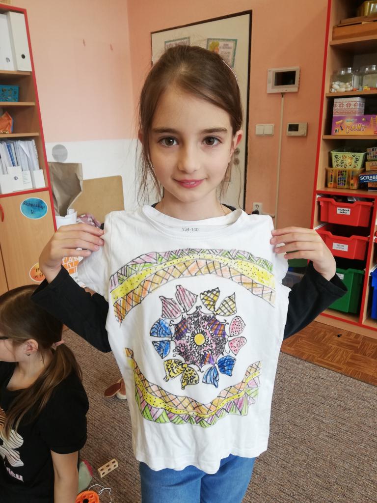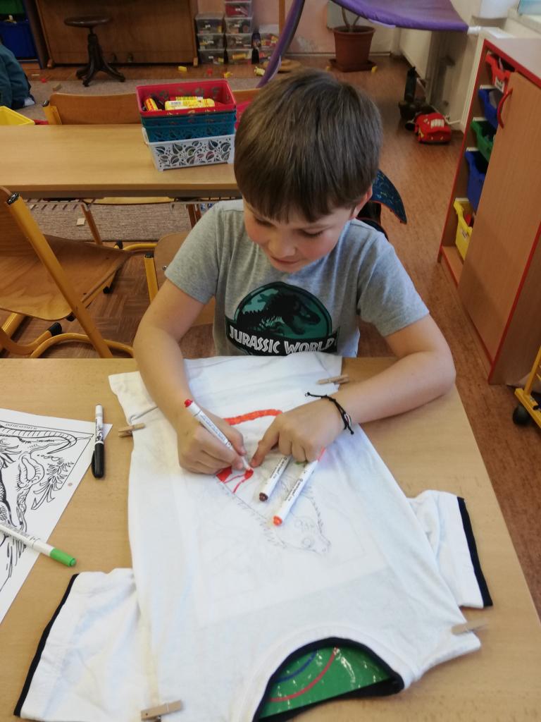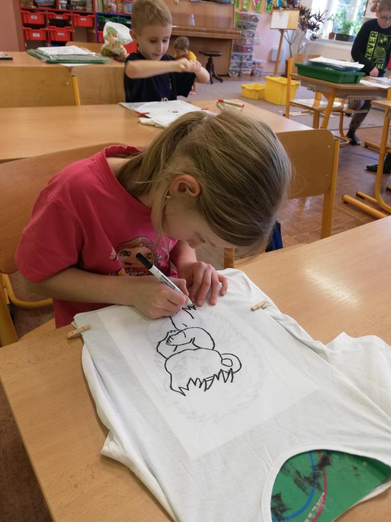 Děti si na donesené trika z domu v družině mohly namalovat dle svých představ obrázky, které chtěly. Trika se jim moc povedly :-)