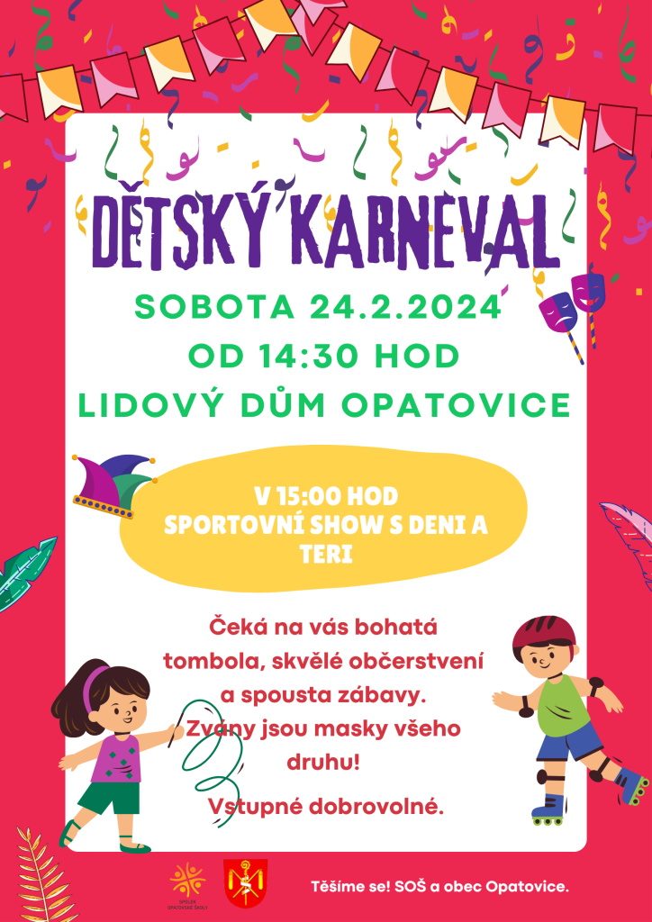 Zveme vás na dětský karneval, který se uskuteční v sobotu 24.2.2024 od 14,30 hodin v lidovém domě v Opatovicích. Od 15 hodin show s Deni a Teri. Bohatá tombola a skvělé občerstvení zajištěno.